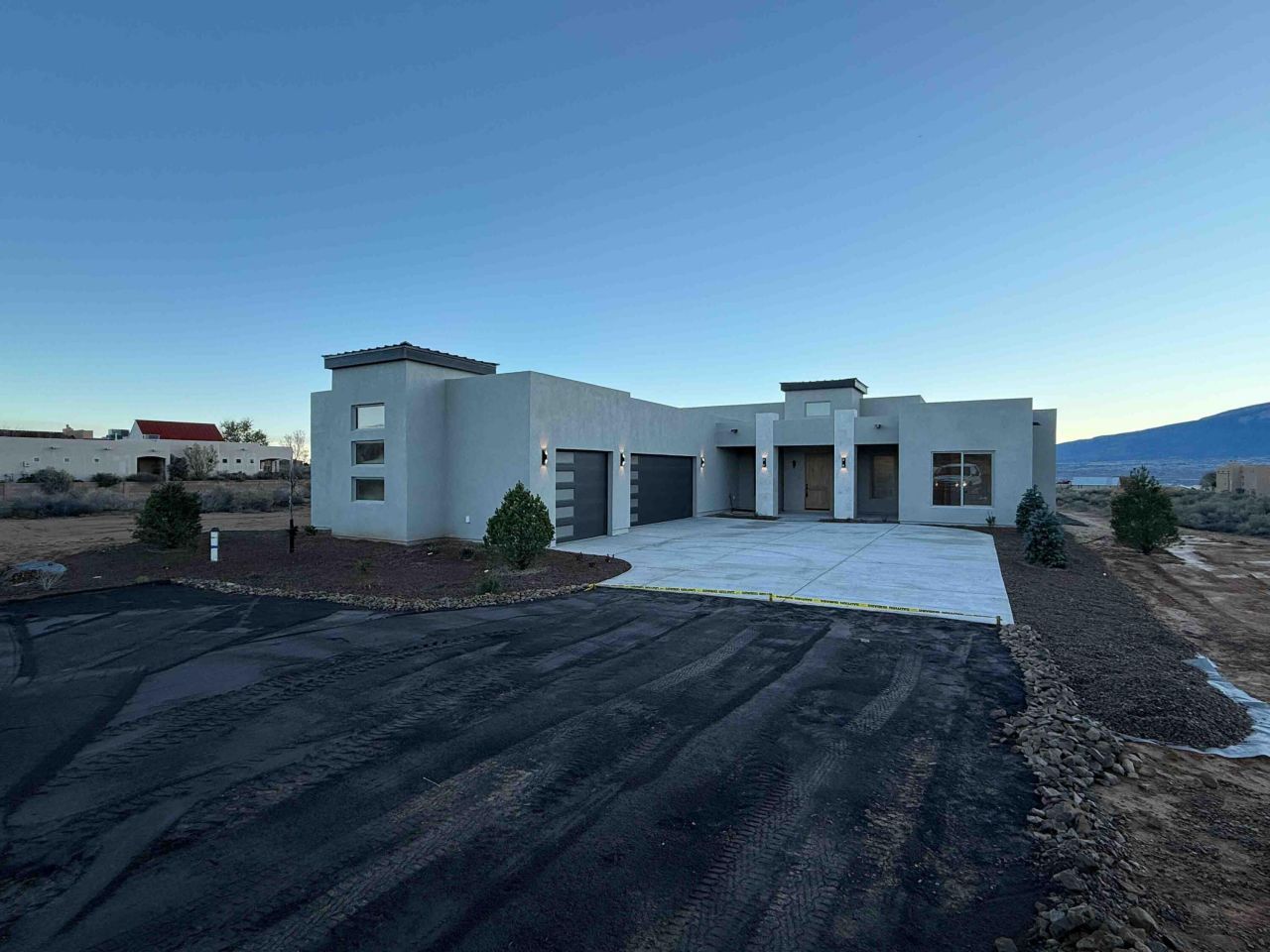Custom Home Located in Rio Rancho on 1/2 acers with Amazing Sandia Mountain Views. This Beautiful Custom Midcentury Modern Home offers Mountain views from every direction, an open floor plan, tall ceilings with large custom wood beams. The cooks kitchen is complete with custom crafted cabinets, quartz counter tops. Stainless steel appliances. Large Center Island, Large Butler's pantry with loads of storage, Big Garage. Large, covered patio off the dining area. Conveniently located just a short 10 minutes' drive to I-25 and is close to restaurants and city amenities. Less than 25 minutes from Albuquerque and 35 minutes South of Santa Fe. Rio Rancho offers a thriving community with a rich artistic and cultural scene, as well as access to hiking trails and other recreational activitie