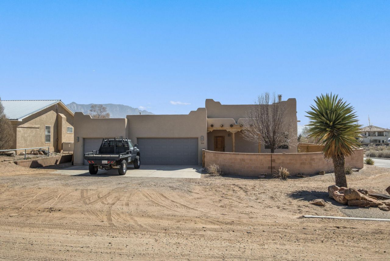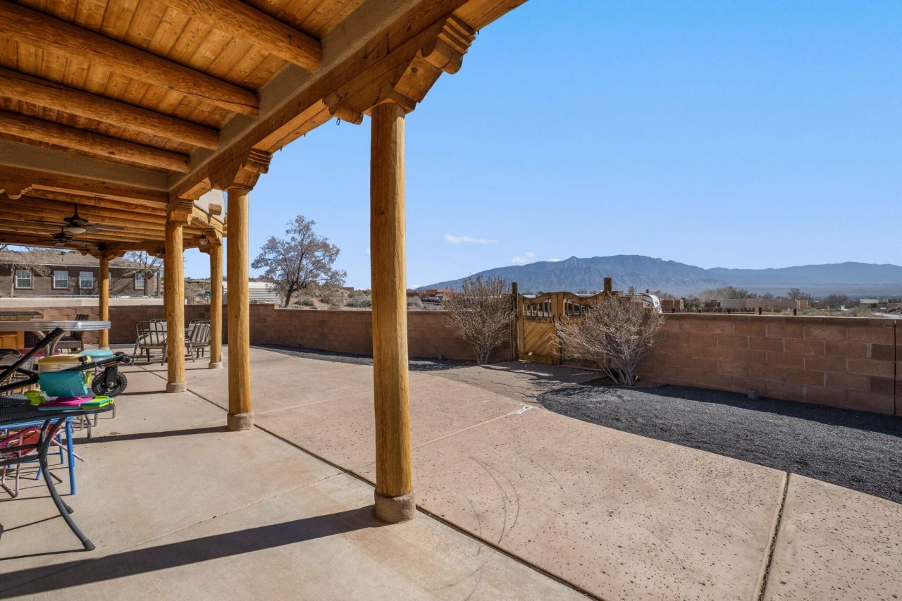 Perched on a corner half-acre lot, this inviting retreat blends cozy charm with incredible outdoor living. Step into the living room with soaring beam ceilings and a warm gas kiva fireplace, opening to an airy kitchen with island--perfect for gathering. The spacious primary suite offers a relaxing bath with double sinks and a separate tub and shower. Outside, your private walled backyard is an entertainer's dream: covered patio with backyard bar and stunning views of the Sandia Mountains. Plenty of room for an RV, camper, or toys plus a 3-car garage complete the package.